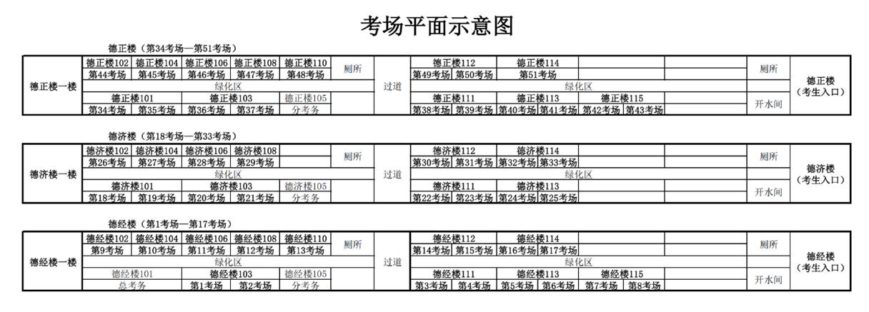 进入学校南门到考试封闭区外(德经楼、德济楼、德正楼东侧大厅)步行时间大约10分钟,请考生合理安排入校时间。