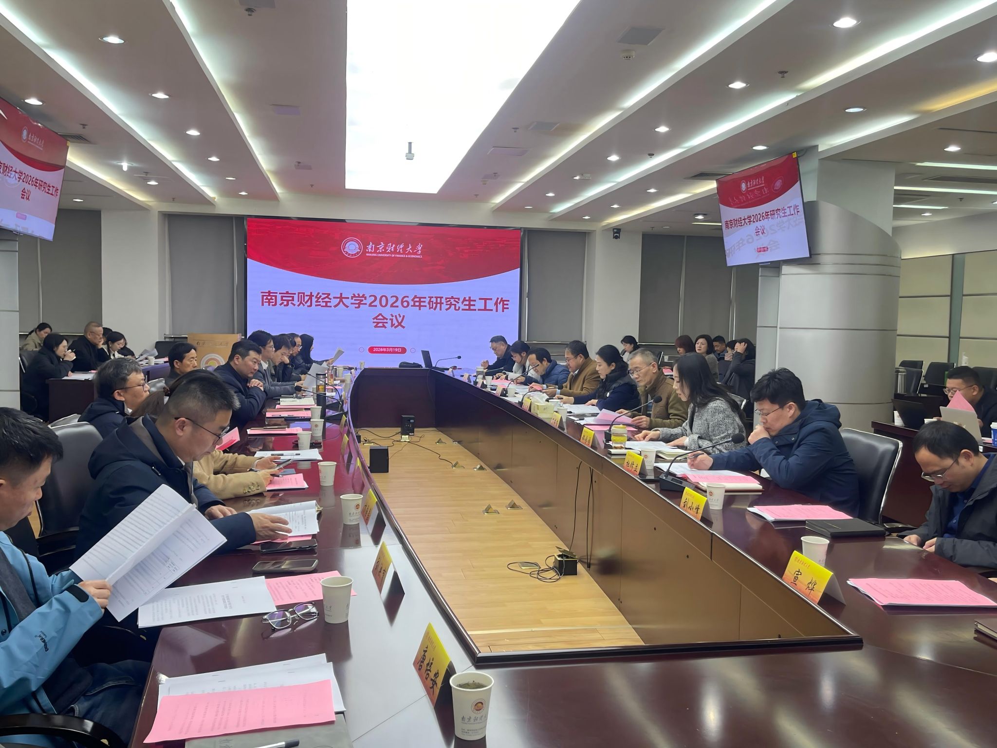 3月19日下午,我校在仙林校区行政楼16楼会议室召开2026年硕士研究生招生复试录取工作布置会。党委常委、副校长姚文韵出席会议,党委研究生工作部、研究生院、学位办公室领导班子成员及相关工作人员,各学院(中心)院长(主任)、分管研究生工作副院长(副主任)、研究生秘书参加会议,江苏省纪委监委派驻南京财经大学纪检监察组副组长、校纪委副书记丁书俊列席会议。会议由研究生院院长、学位办公室主任沈永建主持。